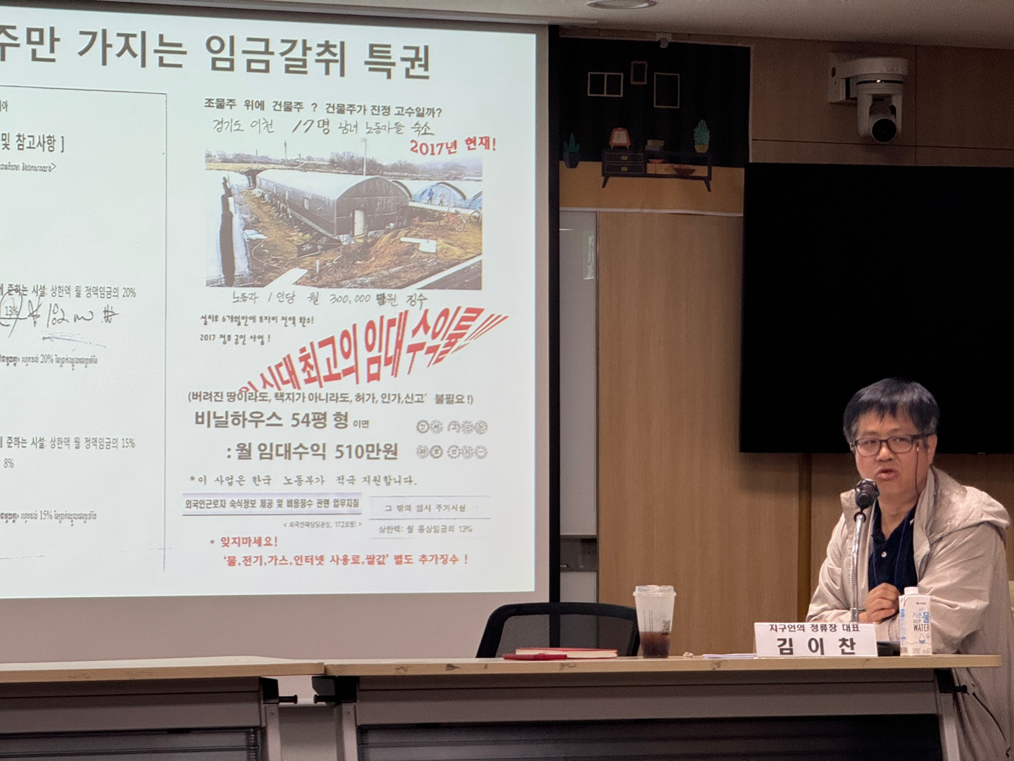 김이찬 대표는 최근 사례를 바탕으로 농업 이주노동자들이 겪는 구조적 착취의 현실을 조명했습니다. 비닐하우스나 컨테이너 같은 가설 건축물에서의 열악한 거주 환경, 과도한 숙소비 공제, 불합리한 이면 계약 등을 구체적으로 소개하였고, 이는 일부 고용주의 문제가 아니라 전반적인 구조와 관행의 문제임을 강조했습니다.