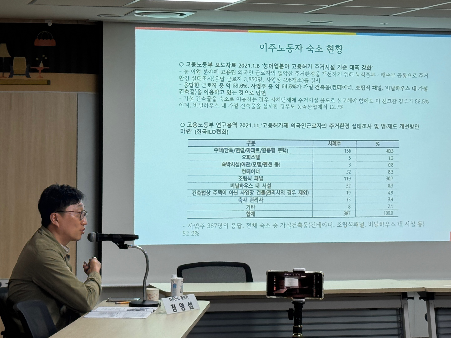 김이찬 대표는 최근 사례를 바탕으로 농업 이주노동자들이 겪는 구조적 착취의 현실을 조명했습니다. 비닐하우스나 컨테이너 같은 가설 건축물에서의 열악한 거주 환경, 과도한 숙소비 공제, 불합리한 이면 계약 등을 구체적으로 소개하였고, 이는 일부 고용주의 문제가 아니라 전반적인 구조와 관행의 문제임을 강조했습니다.