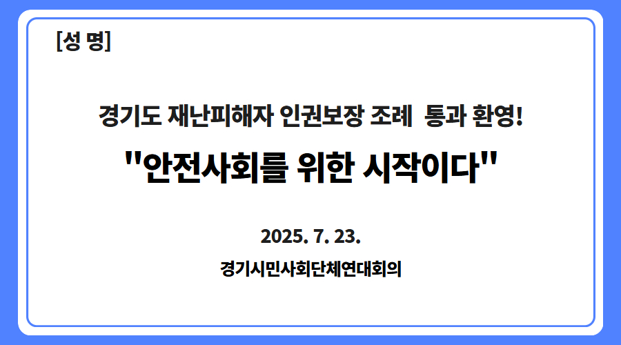 앞으로 재난 참사가 빈번하게 우리 사회를 관통 할 것이라 예상된다. 불과 얼마전 쏟아진 폭우와 맹렬하게 내리쬐는 폭염만 보더라도 모두의 일상이 재난 앞에 안전할 수 없다는 것을 매순간 확인한다. 우리는, 언제든 재난 상황을 마주하게 되더라도 존엄과 인권이 무너지지 않도록 이 조례가 도민들의 든든한 버팀목이 될 수 있기를 기대한다. 이 조례 제정으로 재난 피해자가 타인이 아니라 일상에서 이웃으로 함께 살아갈 수 있도록 재난에 대한 인식과 감수성을 변화시킬 수 있는 계기가 되길 바란다. 경기도 재난피해자 인권보장 조례 제정은 안전사회를 위한 시작이다. 앞으로 경기지역의 시민단체들도 이 조례가 실효성 있게 제 역할과 기능을 다하도록 감시하며 점검해 나갈 것이다.