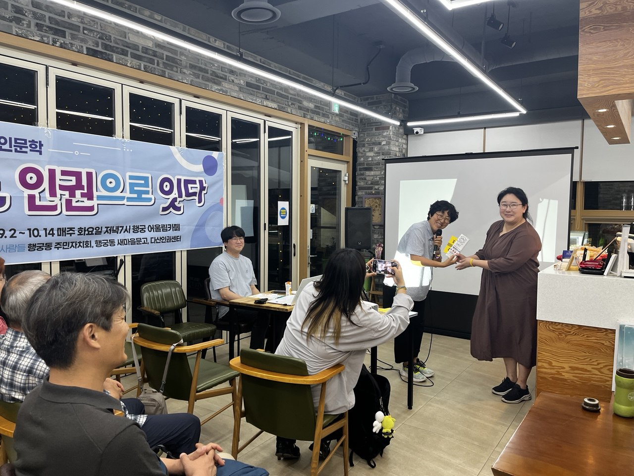 전체적으로 세심함이 돋보였던 의미 있는 기획이었습니다. 좋은 강좌 준비해 주신 모든 분들께 감사 인사를 드립니다. 앞으로 네트워크 파티에서 어떤 이야기들이 오갈지, 또 어떤 활동으로 이어질지 기대가 됩니다. 이번 가을, 행궁동에서 ‘마을과 인권을 잇는 길’ 위에 설 수 있어 기뻤습니다. 이 만남이 앞으로도 이어져 더 따뜻하고 다정한 마을로 확장되기를 바랍니다.