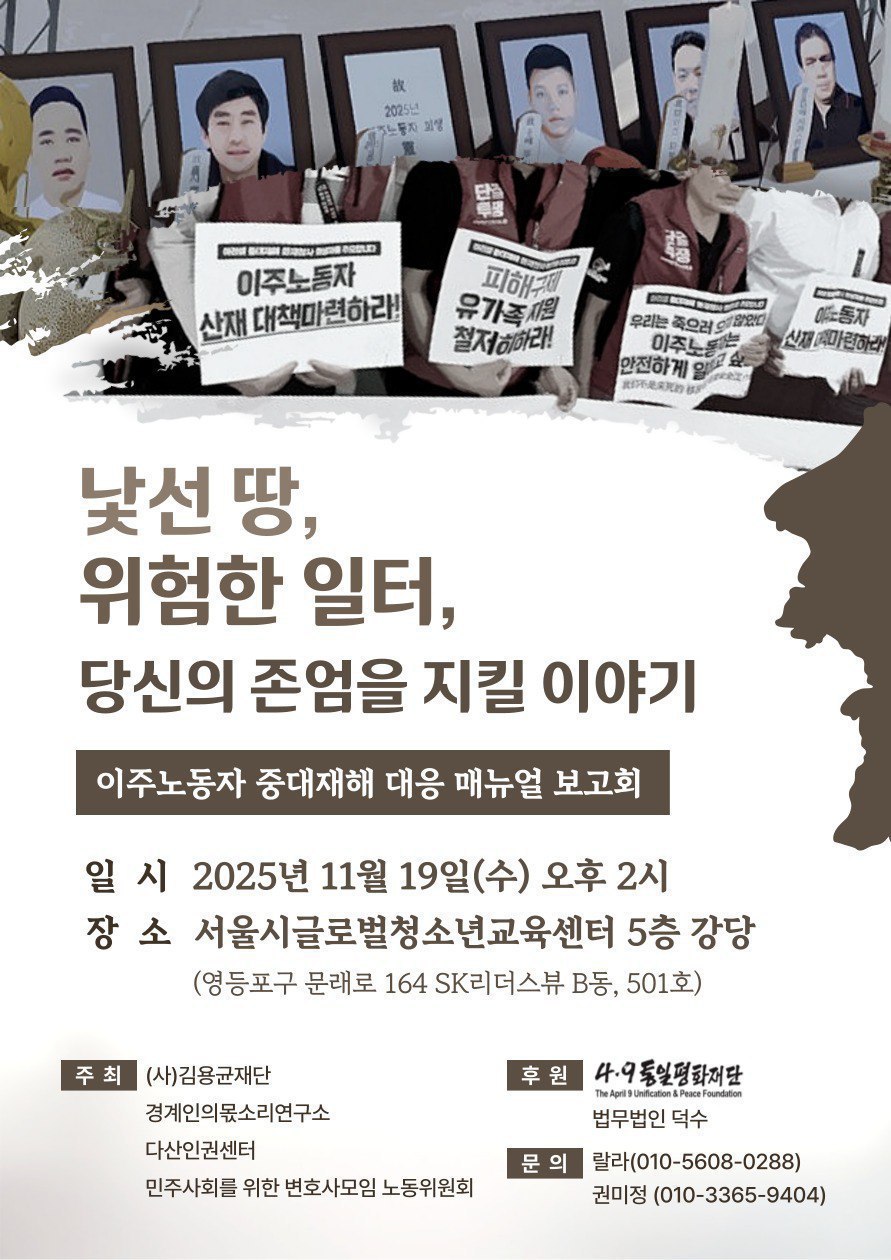 낯선 땅, 위험한 일터에서, 누군가의 존엄을 지킬 수 있도록 부족하지만 이주노동자 중대산업재해에 대응하기 위한 안내서를 만들고 보고회를 합니다.