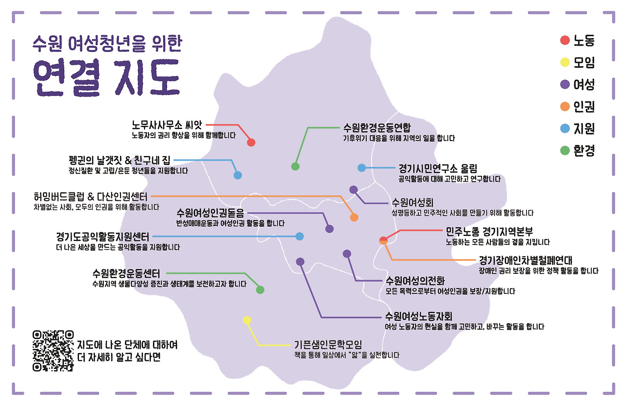 또한 [수원 여성청년을 위한 연결 지도]를 제작했습니다. 활동을 하며 느낀 지역사회 안에서 여성청년이 필요한 정보와 자원을 찾기 어렵다는 문제의식에서 출발해 만들어진 지도에는 여성청년이 안심하고 방문할 수 있도록 허밍버드클럽이 직접 만나온 시민단체와 지원기관들이 안내되어 있습니다. 일상 속에서 도움이 필요한 순간 작은 길잡이가 되기를 바라는 마음을 담았습니다.