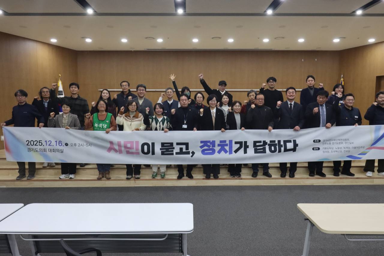 윤석열 퇴진 광장의 목소리가 지역사회에 울려퍼질 수 있도록 2025년 4월 19일 100인의 경기도민이 모여 경기사회대개혁토론회가 진행되었습니다. 그 이후 지역에서 함께 논의해보면 좋을 의제 평등/공공돌봄/용인반도체산단/기후위기와 대중교통 4가지 의제로 연속토론회가 이어졌습니다. 한해 진행된 논의를 마지막으로 정리하는 토론회 <시민이 묻고 정치가 답하다>를 12월 16일 진행했습니다. 이 토론회에는 각 정당에서 참여하여 4가지 의제에 대해 서로 질의하고, 지역사회에 필요한 정책이 무엇인지 논하는 자리였습니다. 국민의 힘, 개혁신당 외 정당들이 참여했고, 시민 일상에 큰 영향을 미치는 이슈들에 정치는 어떤 해법을 내놓을지 진지한 토론으로 이어갔습니다. 한번의 토론으로 새롭게 변화하지는 않겠지요. 그래도 차근차근 시민의 목소리, 시민의 삶에 필요한 질문을 정치에 던지려고 합니다.